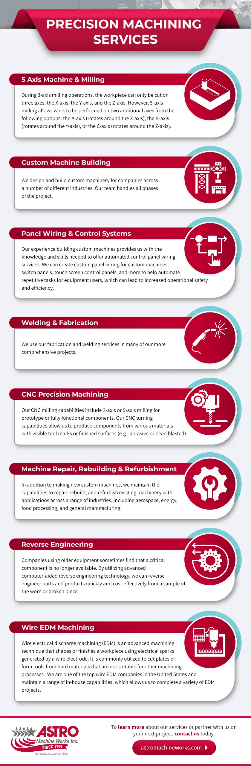 Our team offers a wide range of services to meet the needs of our customers. From 5-axis machining and CNC precision machining to custom machine building and reverse engineering, we have the expertise and capabilities to handle any project. Our services include machine rebuilding, refurbishment, panel wiring, and control systems. We also offer welding and fabrication services, along with Wire EDM machining.